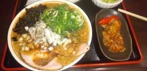 びっくりするぐらいの極太麺です。魚介系の味わいも盛り込まれた醤油ベースのスープは、岩のりとタマネギがアクセントとなり、絶妙な旨味を醸し出しています。都合をつけて、1カ月に3回食べに行きました。