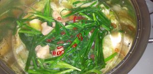 ④最後にスープを入れ、よく混ぜニラをのせる。ニラが柔らかくなれば食べごろです。