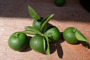 すだちは、ミカン科カンキツ属の常緑樹で、ユズやカボスなどと同じ香酸柑橘です。果実は直径3 – 4センチメートルで、多くは緑色の未熟果が使われて果汁に多くの酸味があります。「すだち」という名前は、果汁を食酢として使用していたことに由来しています。「酢の橘」から酢橘(すたちばな)と名付けられ、「すだち」と呼ばれるようになりました。